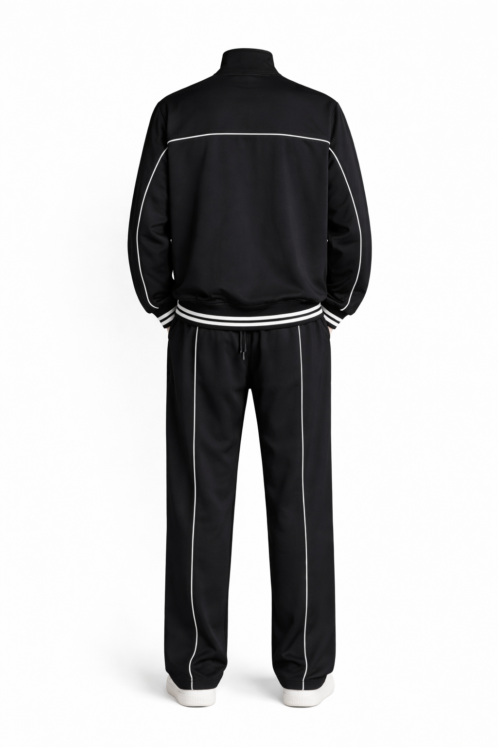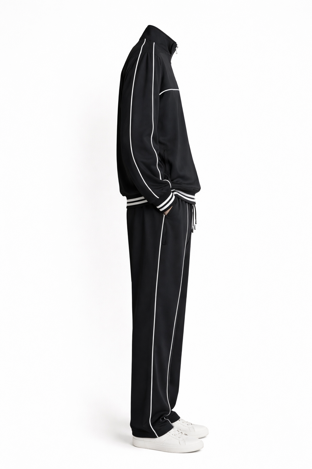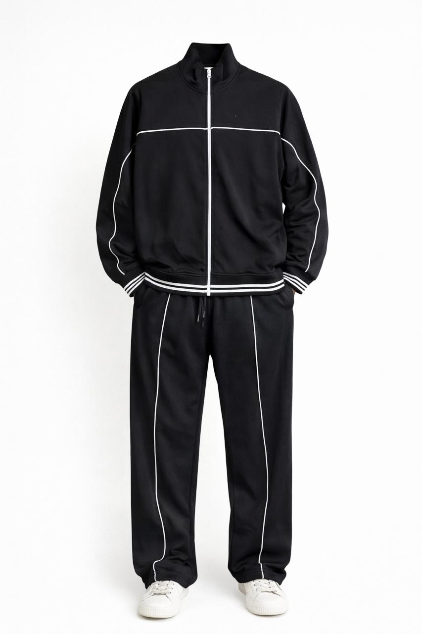 Upgrade your everyday wardrobe with this sleek black tracksuit designed for comfort and modern style. Featuring a zip-up jacket with a structured collar and contrast white piping details, this set delivers a sharp, sporty look. The matching trousers are tailored with a relaxed fit and clean side piping, creating a streamlined silhouette.