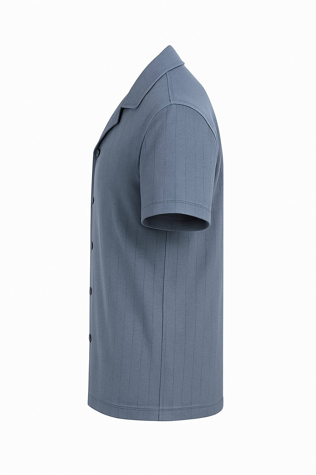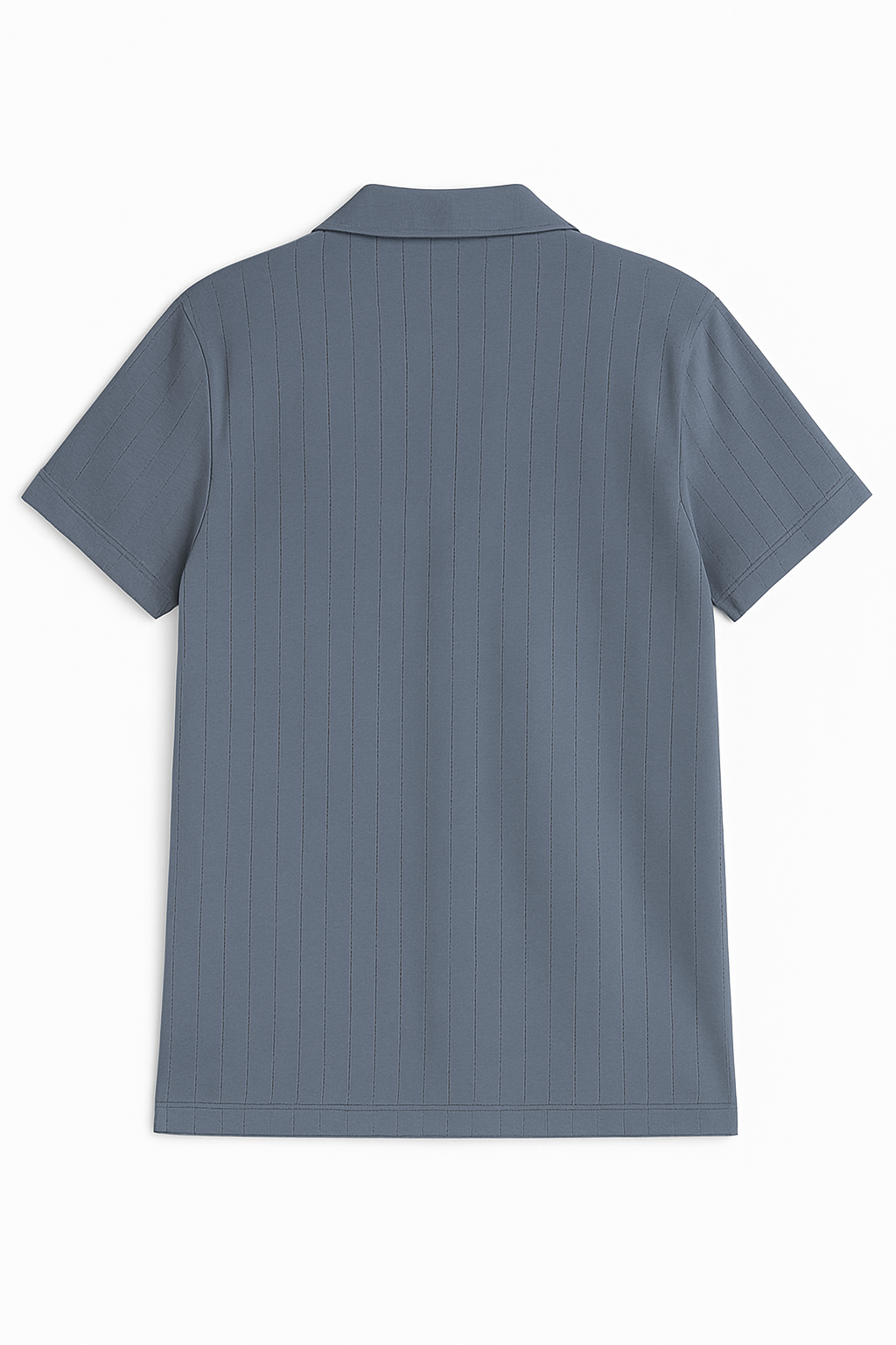 A sleek slate blue Cuban collar shirt with subtle vertical texture, crafted from soft lightweight fabric for a relaxed yet refined look.