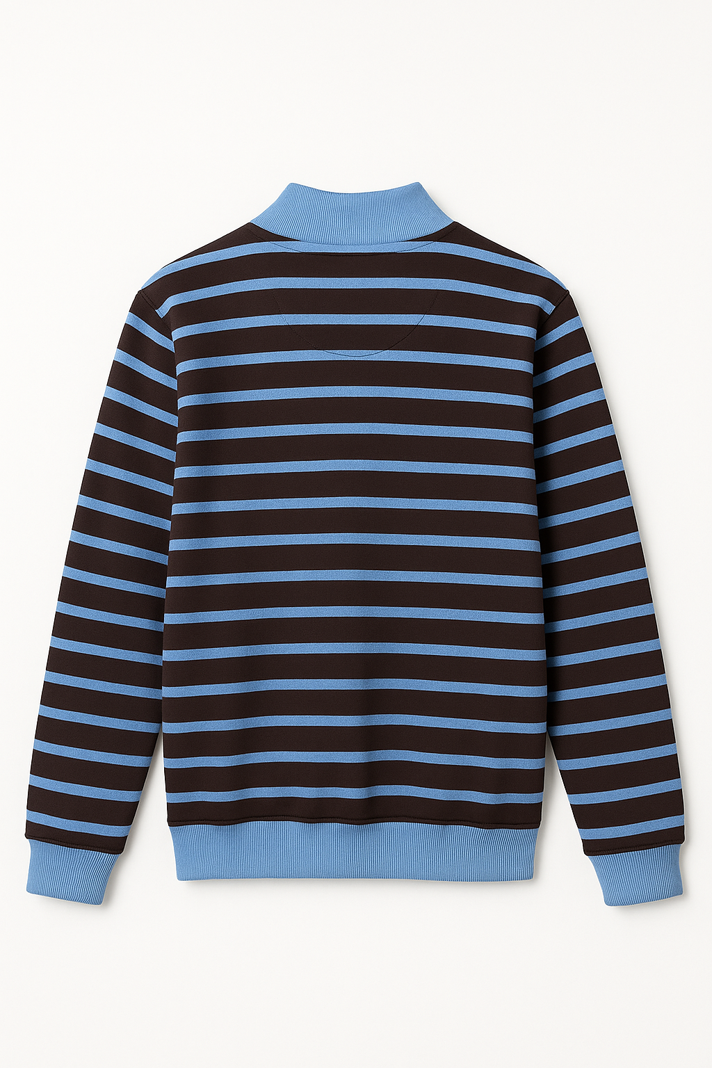 Elevate your winter wardrobe with our Brown & Blue Striped Zip-Up Sweatshirt, a perfect blend of comfort, style, and everyday versatility. Designed with a modern athletic-inspired look, this piece features a bold brown base accented with cool blue horizontal stripes and matching blue ribbed cuffs, collar, and hem.