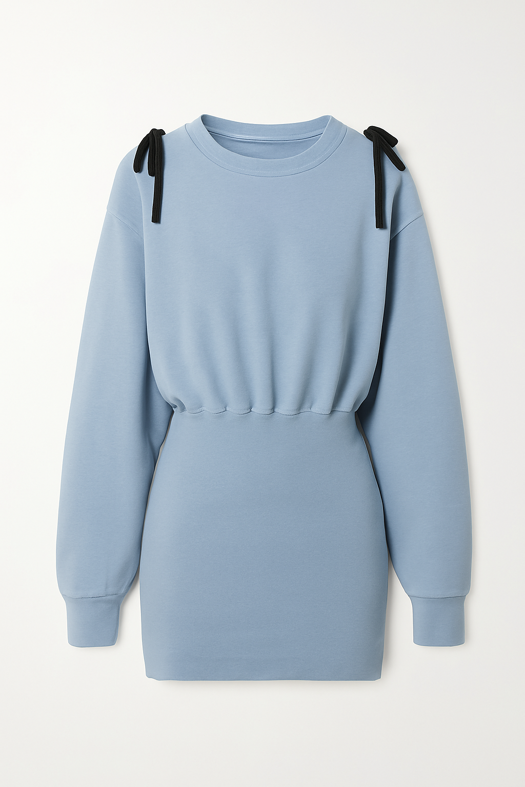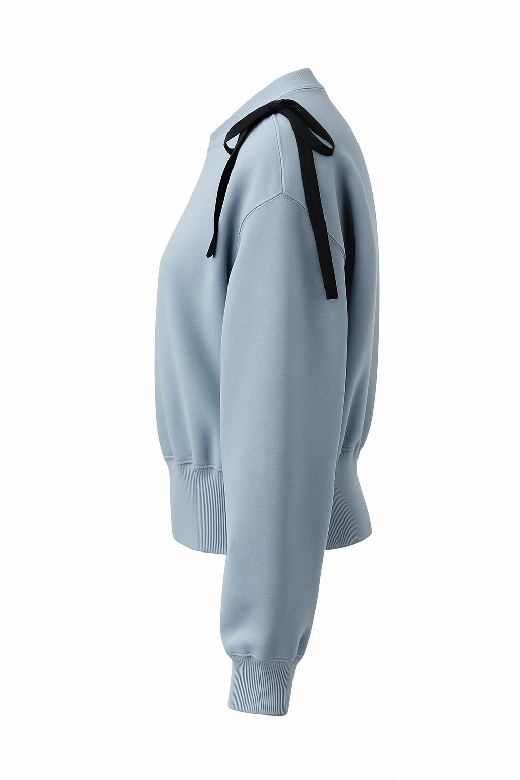 Powder blue fleece sweatshirt with chic black ribbon shoulder ties and a snatched cinched waist, designed for a flattering yet comfortably relaxed fit.