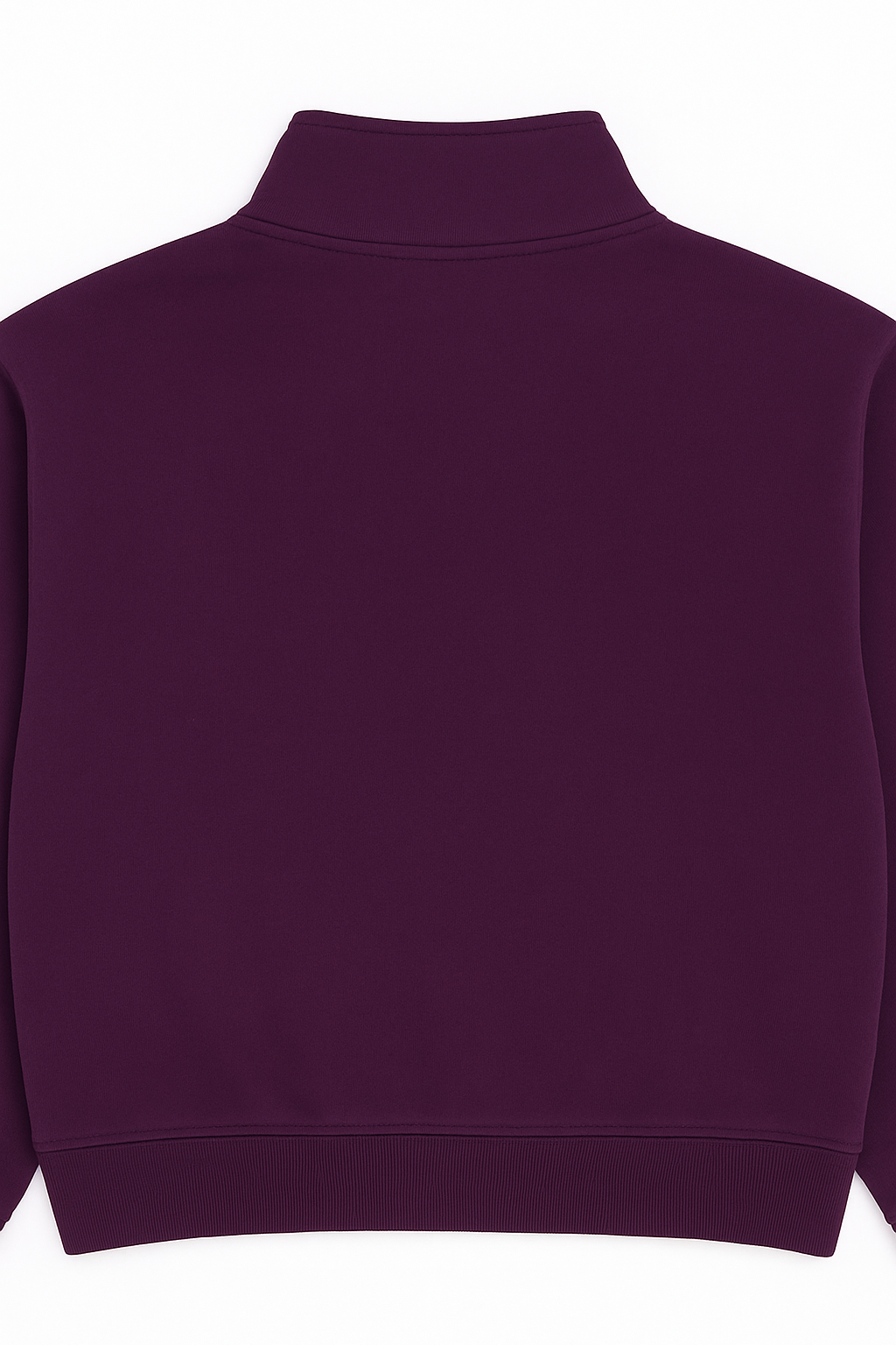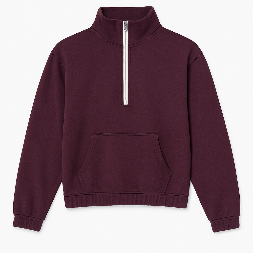 rich maroon half-zip sweatshirt crafted from soft cotton blend, featuring a high collar and relaxed fit for timeless, effortless style.