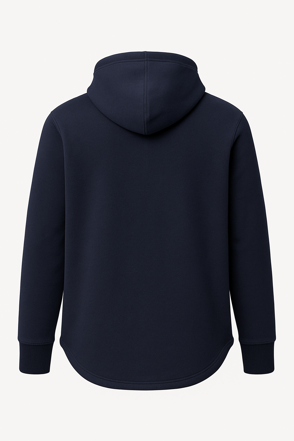 A premium navy half-zip hoodie designed with a modern curved hem, structured hood, and heavyweight fleece for unmatched comfort and minimal everyday style.