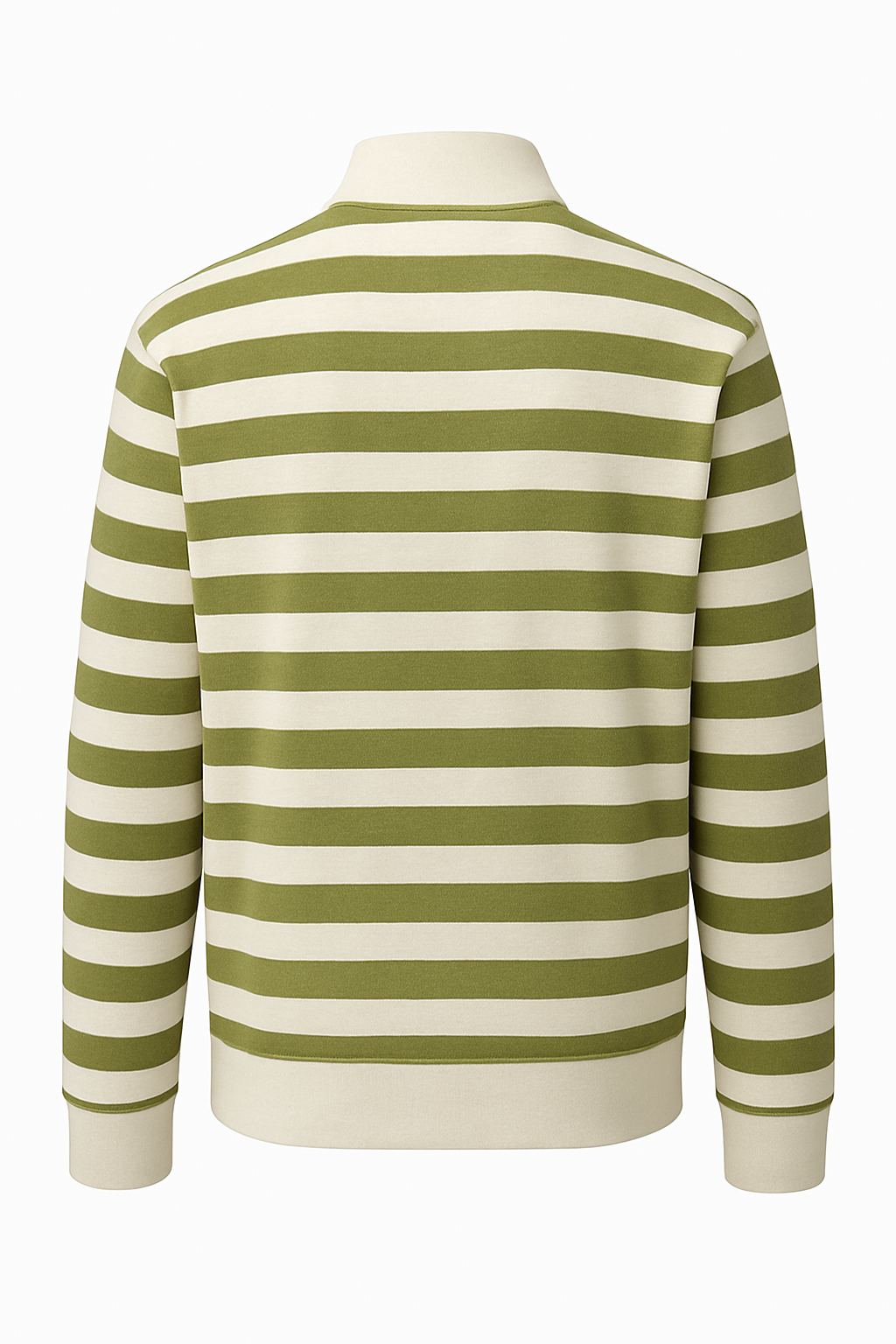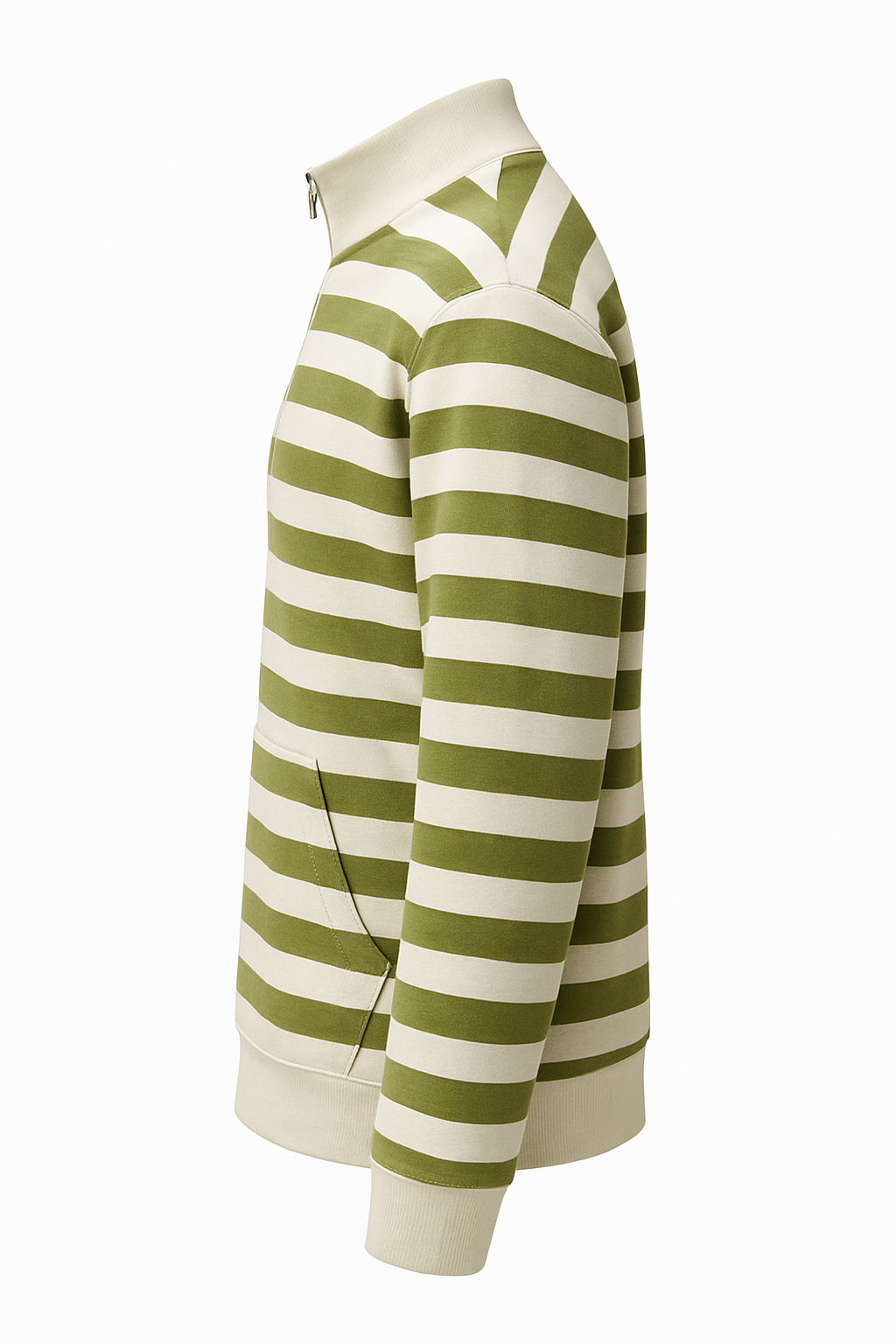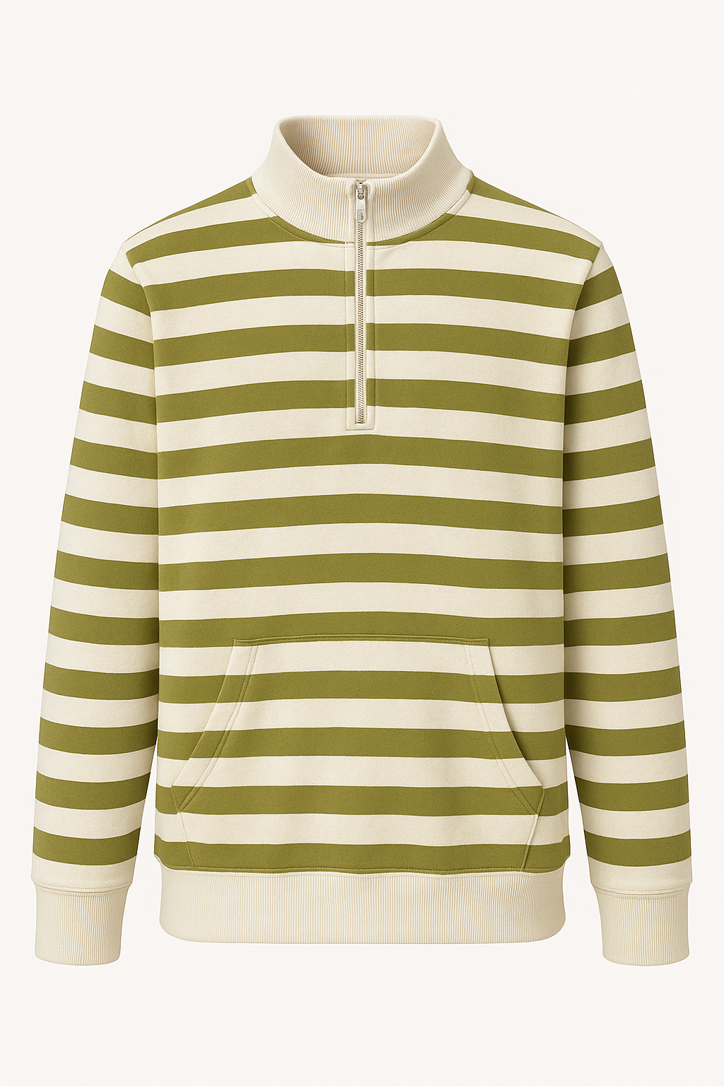 Olive and cream striped half-zip sweatshirt made from soft winter fleece, featuring a ribbed mock-neck, kangaroo pocket, and a relaxed everyday fit.